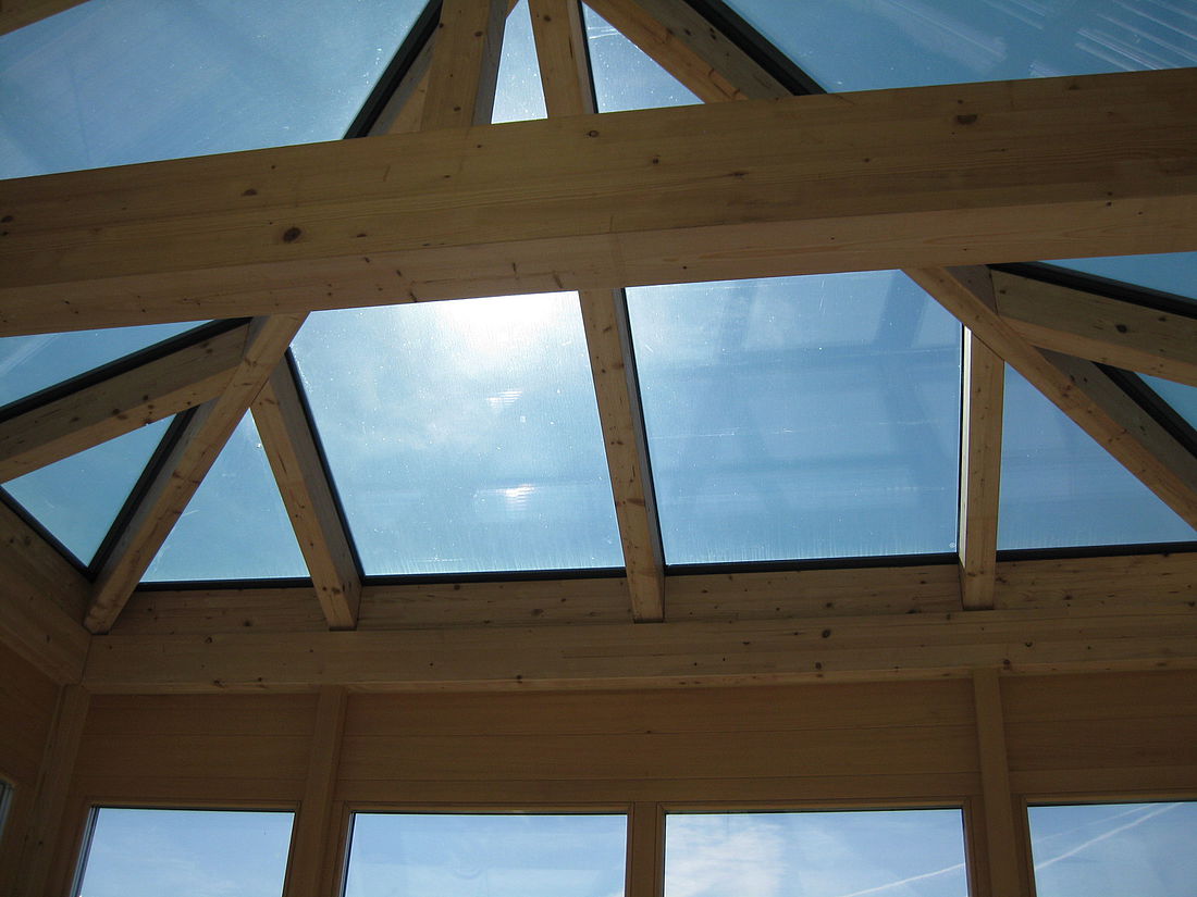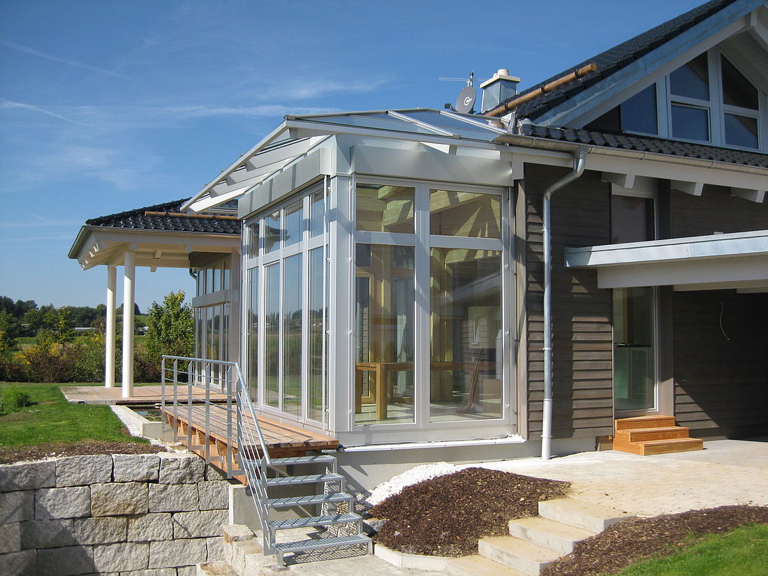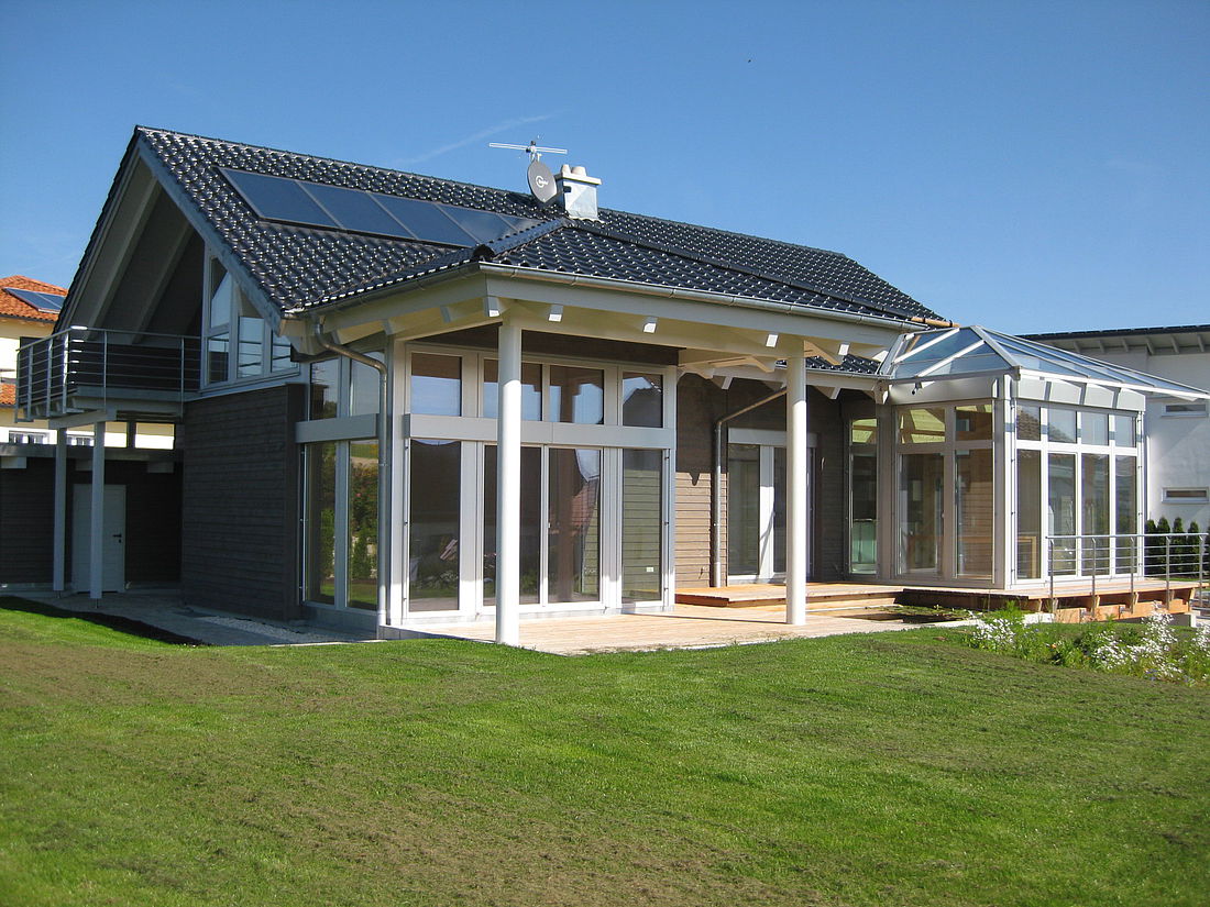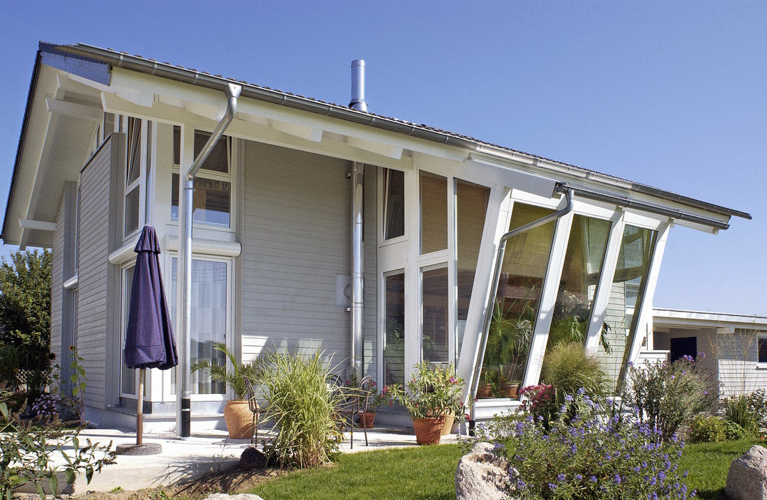 Unsere Dachüberstände sorgen für ein ideales Klima im Haus. Den Wintergarten schützt eine automatisch gesteuerte Markise vor zu viel Sonne.