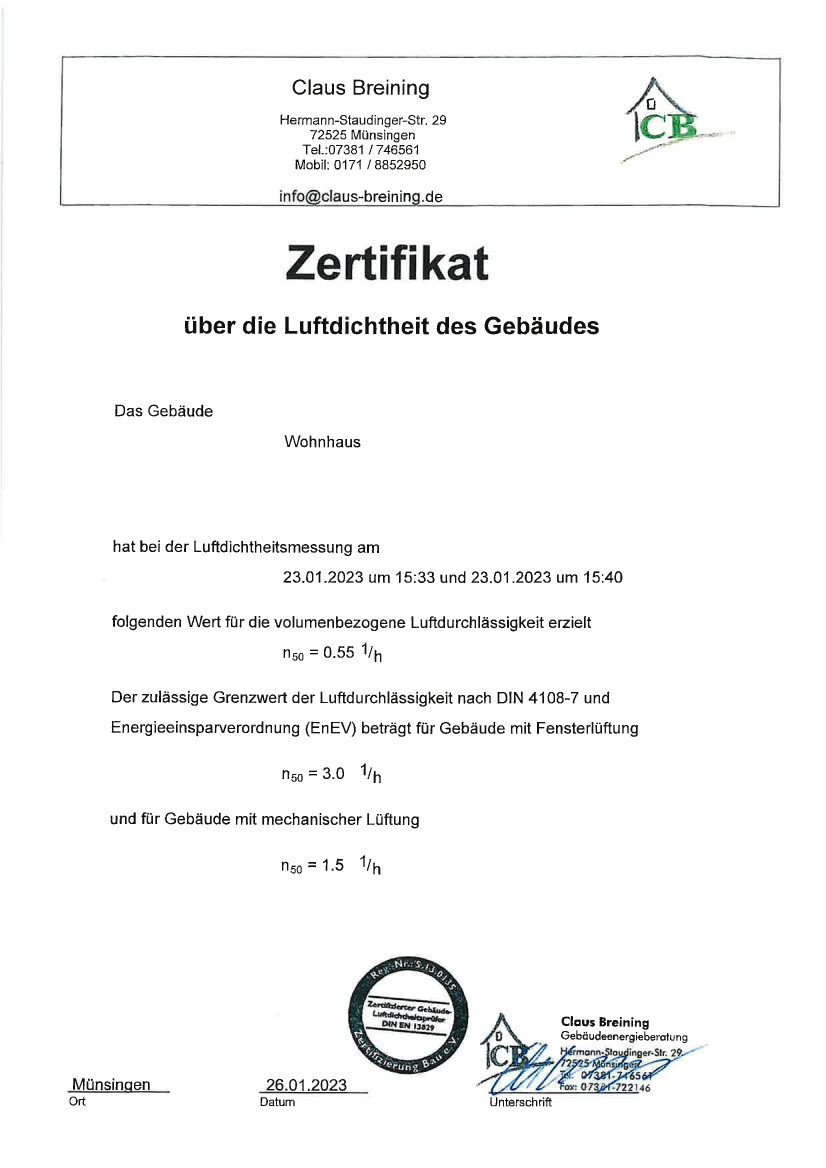Der Primärenergiebedarf eines Neubaus nach GEG darf aktuell 47,7 kWh/m²a (Kilowatt pro Quadratmeter pro Jahr) betragen, um als klimafreundlicher Neubau zu gelten sogar nur 34,7 kWh/m²a. Unser Haus erreicht den Spitzenwert von nur 12,3 kWh/m²a.
